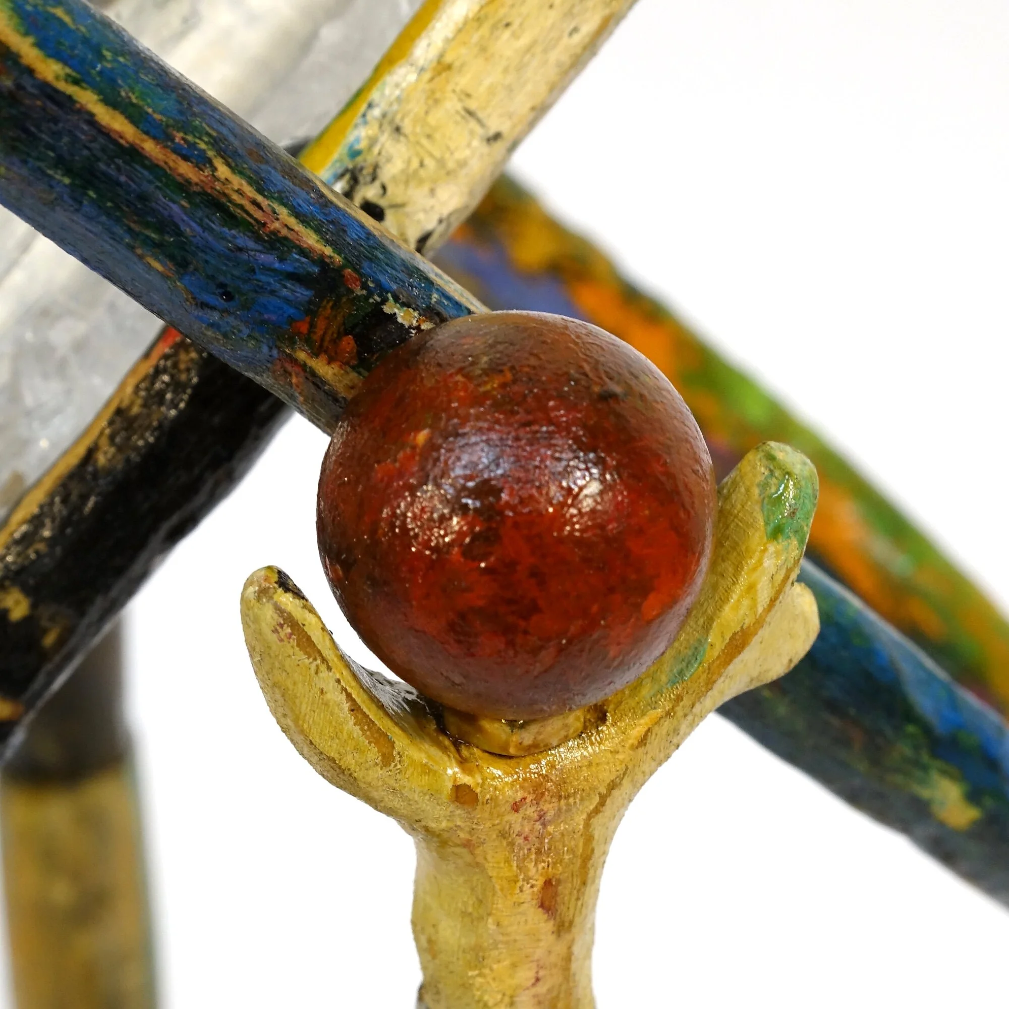 This particular piece, “Force Fields 02”, is a wedding mezuzah, meaning it has a container to hold all the shards of glass that sometimes gets broken at a Jewish wedding. The three rings of “energy” can be spun or placed in any position of “surrounding”. The center ring that includes the scroll is attached to the handle at the top and the gears below. When you spin that (using the handle or the ring) it churns around the broken glass, never to be the same. The base serves as almost a “key” to the meanings of the rings, reinforcing the correspondence between the shin parts and the energy forces.